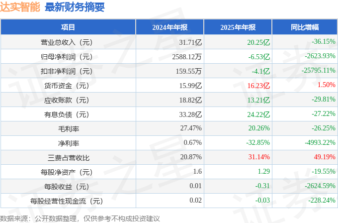 据证券之星公开数据整理,近期达实智能(002421)发布2025年年报。截至本报告期末,公司营业总收入20.25亿元,同比下降36.15%,归母净利润-6.53亿元,同比下降2623.93%。按单季度数据看,第四季度营业总收入5.52亿元,同比下降46.17%,第四季度归母净利润-2.39亿元,同比下降979.02%。本报告期达实智能三费占比上升明显,财务费用、销售费用和管理费用总和占总营收同比增幅达49.19%。