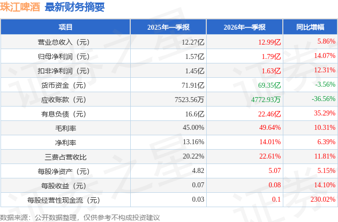 据证券之星公开数据整理,近期珠江啤酒(002461)发布2026年一季报。截至本报告期末,公司营业总收入12.99亿元,同比上升5.86%,归母净利润1.79亿元,同比上升14.07%。按单季度数据看,第一季度营业总收入12.99亿元,同比上升5.86%,第一季度归母净利润1.79亿元,同比上升14.07%。本报告期珠江啤酒盈利能力上升,毛利率同比增幅10.31%,净利率同比增幅6.39%。