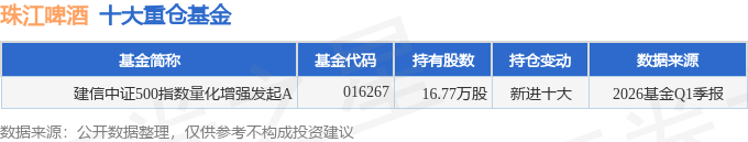 持有珠江啤酒最多的基金为建信中证500指数量化增强发起A,目前规模为1.09亿元,最新净值1.464(4月24日),较上一交易日下跌0.18%,近一年上涨44.91%。该基金现任基金经理为叶乐天 刘明辉。