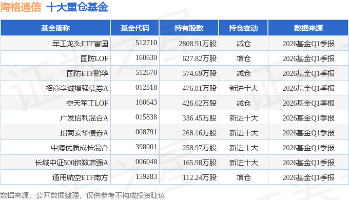 持有海格通信最多的基金为军工龙头ETF富国,目前规模为95.77亿元,最新净值0.7774(4月24日),较上一交易日下跌2.75%,近一年上涨32.66%。该基金现任基金经理为王乐乐 牛志冬。