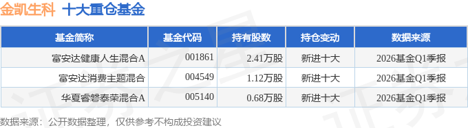持有金凯生科最多的基金为富安达健康人生混合A,目前规模为0.32亿元,最新净值1.3716(4月24日),较上一交易日下跌0.77%,近一年上涨11.01%。该基金现任基金经理为李守峰。