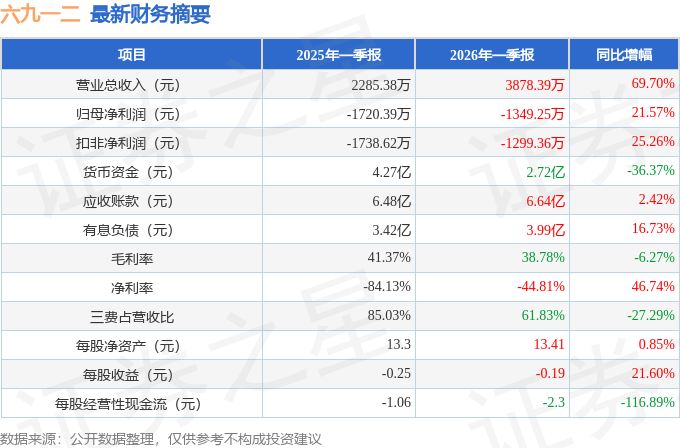 据证券之星公开数据整理,近期六九一二(301592)发布2026年一季报。截至本报告期末,公司营业总收入3878.39万元,同比上升69.7%,归母净利润-1349.25万元,同比上升21.57%。按单季度数据看,第一季度营业总收入3878.39万元,同比上升69.7%,第一季度归母净利润-1349.25万元,同比上升21.57%。本报告期六九一二公司应收账款体量较大,当期应收账款占最新年报归母净利润比达1247.02%。