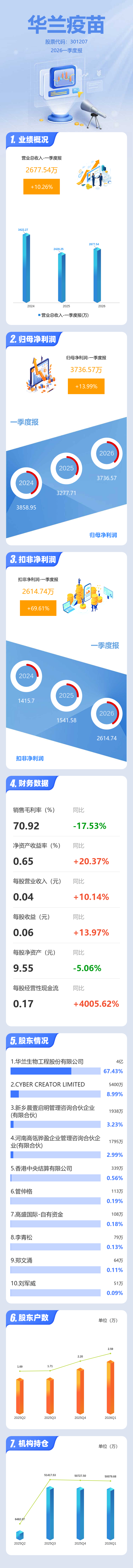 证券之星消息,华兰疫苗2026年一季报显示,一季度公司主营收入2677.54万元,同比上升10.27%;归母净利润3736.57万元,同比上升14.0%;扣非净利润2614.74万元,同比上升69.61%;负债率16.05%,投资收益1471.91万元,财务费用-29.39万元,毛利率70.92%。