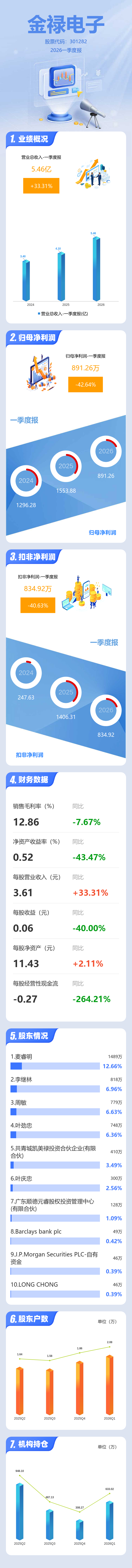 证券之星消息,金禄电子2026年一季报显示,一季度公司主营收入5.46亿元,同比上升33.32%;归母净利润891.26万元,同比下降42.64%;扣非净利润834.92万元,同比下降40.63%;负债率48.92%,投资收益-25.38万元,财务费用620.51万元,毛利率12.86%。