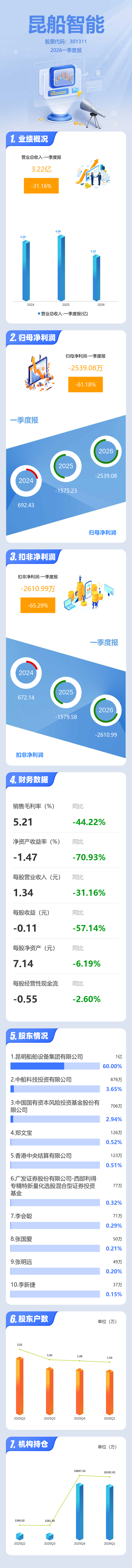 证券之星消息,昆船智能2026年一季报显示,一季度公司主营收入3.22亿元,同比下降31.16%;归母净利润-2539.08万元,同比下降61.19%;扣非净利润-2610.99万元,同比下降65.3%;负债率55.64%,投资收益1.39万元,财务费用208.27万元,毛利率5.21%。