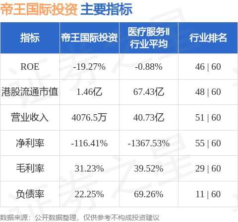 帝王国际投资港股市值1.46亿港元,在医疗服务Ⅱ行业中排名第48。主要指标见下表: