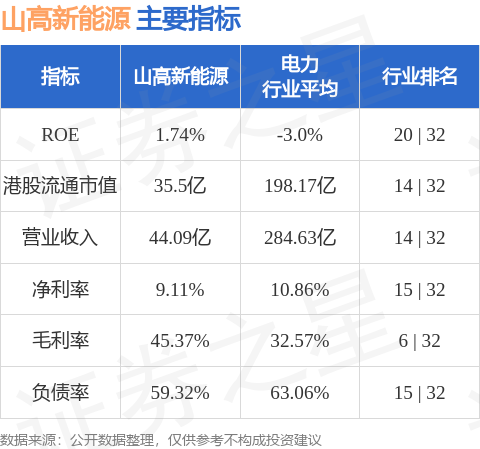 山高新能源港股市值35.5亿港元,在电力行业中排名第14。主要指标见下表: