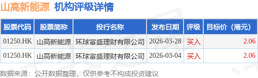 投行对该股的评级以买入为主,近90天内共有2家投行给出买入评级,近90天的目标均价为2.06港元。环球富盛理财有限公司最新一份研报给予山高新能源买入评级,目标价2.06港元。