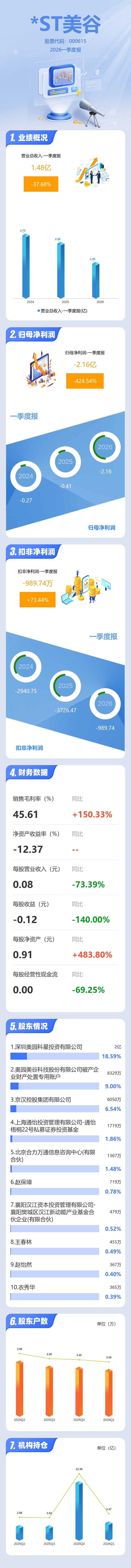 证券之星消息,*ST美谷2026年一季报显示,一季度公司主营收入1.48亿元,同比下降37.68%;归母净利润-2.16亿元,同比下降424.55%;扣非净利润-989.74万元,同比上升73.44%;负债率26.09%,投资收益-2.06亿元,财务费用370.48万元,毛利率45.61%。