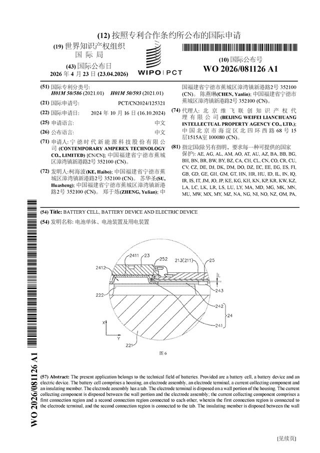 证券之星消息,根据企查查数据显示宁德时代(300750)公布了一项国际专利申请,专利名为“电池单体、电池装置及用电装置”,专利申请号为PCT/CN2024/125321,国际公布日为2026年4月23日。