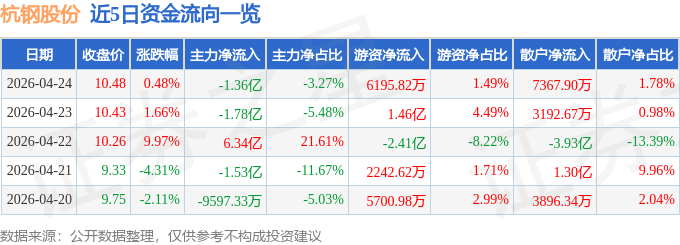 4月24日的资金流向数据方面,主力资金净流出1.36亿元,占总成交额3.27%,游资资金净流入6195.82万元,占总成交额1.49%,散户资金净流入7367.9万元,占总成交额1.78%。