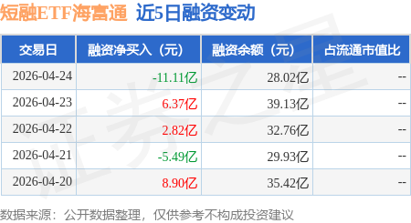 证券之星消息,4月24日,短融ETF海富通(511360)融资买入45.24亿元,融资偿还56.35亿元,融资净卖出11.11亿元,融资余额28.02亿元,近20个交易日中有12个交易日出现融资净买入。