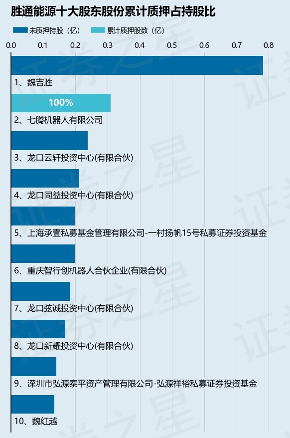 截止本公告日,股东七腾机器人有限公司已累计质押股份3101.82万股,占其持股总数的100.0%。本次质押后胜通能源十大股东的累计质押股份占持股比例(占持股比例的计算以公司最新一期财务报表公布的十大股东的持股总数为基准)见下图: