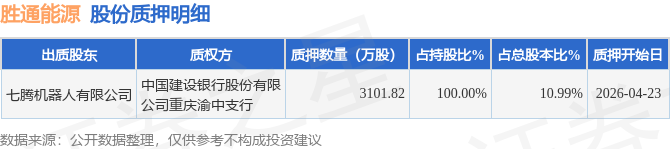 证券之星消息,胜通能源(001331)4月27日公开信息显示,股东七腾机器人有限公司向中国建设银行股份有限公司重庆渝中支行合计质押3101.82万股,占总股本10.99%。质押详情见下表: