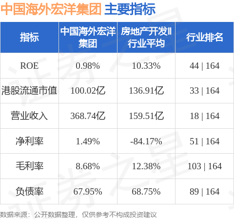 中国海外宏洋集团港股市值100.02亿港元,在房地产开发Ⅱ行业中排名第33。主要指标见下表: