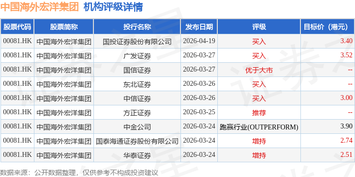 投行对该股的评级以买入为主,近90天内共有4家投行给出买入评级,近90天的目标均价为3.18港元。国投证券股份有限公司最新一份研报给予中国海外宏洋集团买入评级,目标价3.4港元。