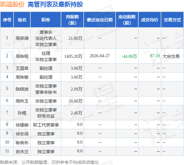 证券之星消息,根据4月27日市场公开信息、上市公司公告及交易所披露数据整理,凯迪股份(605288)最新董监高及相关人员股份变动情况:2026年4月27日公司总裁,董事周殊程共减持公司股份44.8万股,占公司总股本为0.6339%。变动期间公司股价下跌0.22%,4月27日当日收盘报82.48元。
