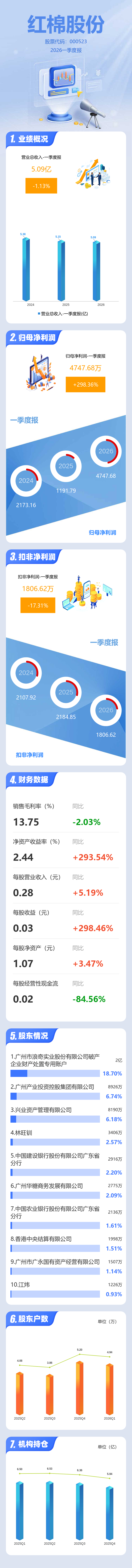 证券之星消息,红棉股份2026年一季报显示,一季度公司主营收入5.09亿元,同比下降1.14%;归母净利润4747.68万元,同比上升298.36%;扣非净利润1806.62万元,同比下降17.31%;负债率36.84%,投资收益6.94万元,财务费用498.85万元,毛利率13.75%。