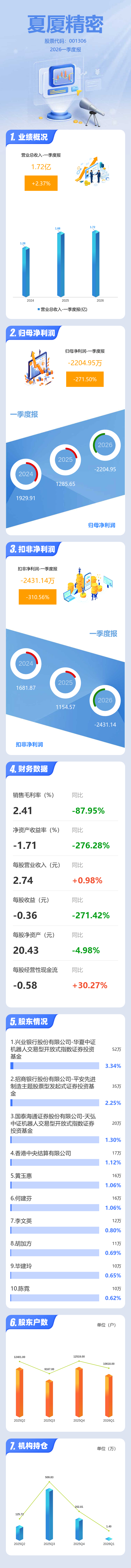 证券之星消息,夏厦精密2026年一季报显示,一季度公司主营收入1.72亿元,同比上升2.37%;归母净利润-2204.95万元,同比下降271.5%;扣非净利润-2431.14万元,同比下降310.57%;负债率42.97%,财务费用395.38万元,毛利率2.41%。