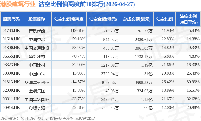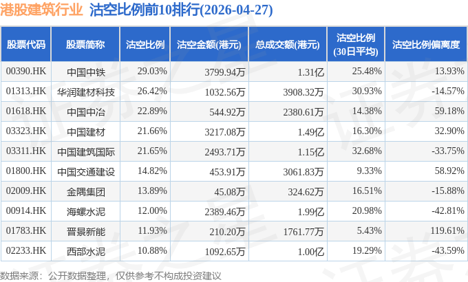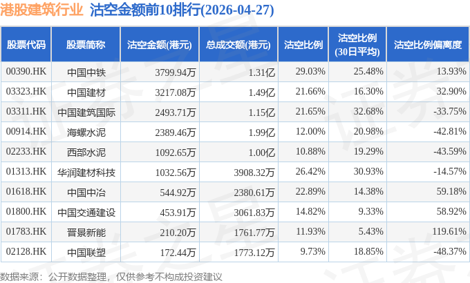 从沽空金额来看,中国中铁、中国建材、中国建筑国际沽空金额位居行业前三,分别为3799.94万港元、3217.08万港元、2493.71万港元。