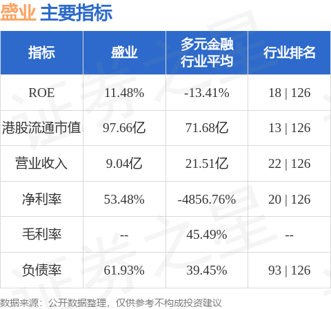 盛业港股市值97.66亿港元,在多元金融行业中排名第13。主要指标见下表: