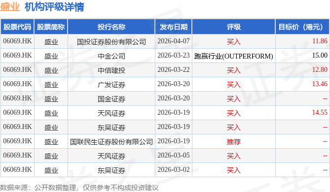截至2026年4月27日收盘,盛业(06069.HK)报收于8.96港元,下跌2.29%,成交量429.15万股,成交额3889.48万港元。投行对该股的评级以买入为主,近90天内共有8家投行给出买入评级,近90天的目标均价为13.53港元。国投证券股份有限公司最新一份研报给予盛业买入评级,目标价11.86港元。