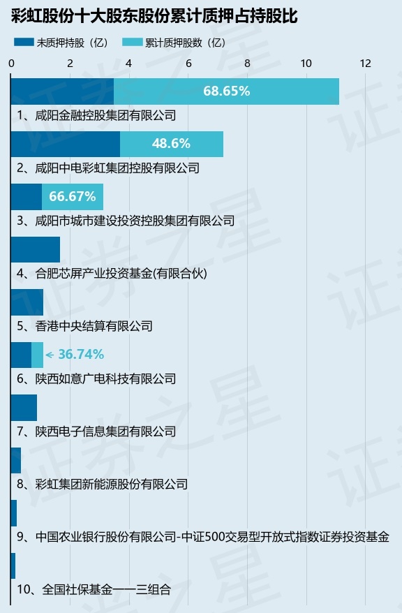 截止本公告日,股东咸阳金融控股集团有限公司已累计质押股份7.64亿股,占其持股总数的68.65%,股东咸阳中电彩虹集团控股有限公司已累计质押股份3.5亿股,占其持股总数的48.6%,股东咸阳市城市建设投资控股集团有限公司已累计质押股份2.1亿股,占其持股总数的66.67%,股东陕西如意广电科技有限公司已累计质押股份4000.0万股,占其持股总数的36.74%。本次质押后彩虹股份十大股东的累计质押股份占持股比例(占持股比例的计算以公司最新一期财务报表公布的十大股东的持股总数为基准)见下图: