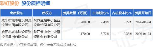 证券之星消息,彩虹股份(600707)4月27日公开信息显示,股东咸阳市城市建设投资控股集团有限公司向陕西金控中小企业投资管理有限公司、陕西省中小企业融资担保有限公司合计质押1950.0万股,占总股本0.55%。质押详情见下表: