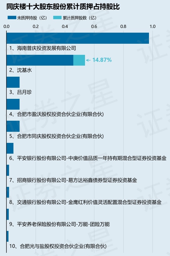 截止本公告日,股东沈基水已累计质押股份800.0万股,占其持股总数的14.87%。本次质押后同庆楼十大股东的累计质押股份占持股比例(占持股比例的计算以公司最新一期财务报表公布的十大股东的持股总数为基准)见下图: