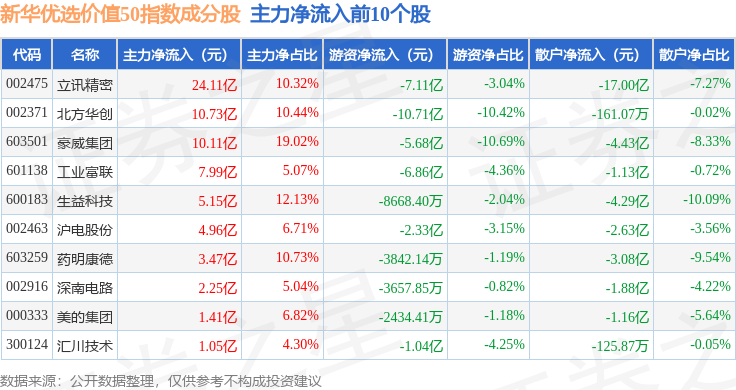 资金流向方面,新华优选价值50(989004)指数成份股当日主力资金净流出合计40.75亿元,游资资金净流入合计31.04亿元,散户资金净流入合计9.71亿元。成份股资金流向详情见下表: