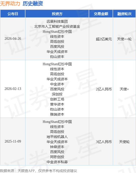 证券之星消息,根据天眼查APP于4月26日公布的信息整理,无界动力(北京)技术研发有限公司天使++轮融资,融资额超2亿美元,参与投资的机构包括远景科技集团,北京市人工智能产业投资基金,HongShan红杉中国,线性资本,高瓴创投,百度风投,华业天成资本,钧山资本。