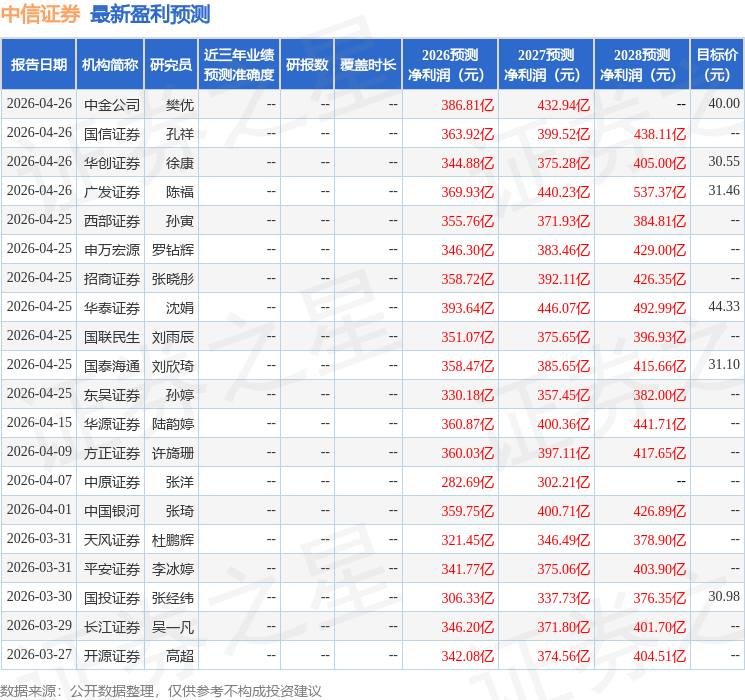 开源证券股份有限公司高超,卢崑近期对中信证券进行研究并发布了研究报告《中信证券2026年一季报点评:海外投行和投资收益表现亮眼,ROE和估值错配》,给予中信证券买入评级。