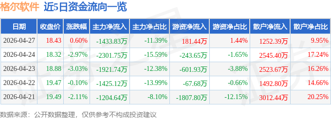 证券之星消息,截至2026年4月27日收盘,格尔软件(603232)报收于18.43元,上涨0.6%,换手率3.0%,成交量6.93万手,成交额1.26亿元。