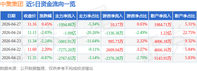 证券之星消息,截至2026年4月27日收盘,中集集团(000039)报收于11.16元,上涨0.45%,换手率1.45%,成交量33.47万手,成交额3.74亿元。