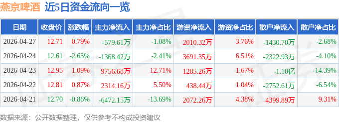 证券之星消息,截至2026年4月27日收盘,燕京啤酒(000729)报收于12.71元,上涨0.79%,换手率1.67%,成交量41.94万手,成交额5.34亿元。