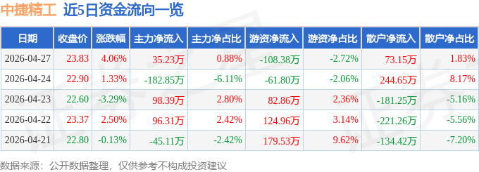 证券之星消息,截至2026年4月27日收盘,中捷精工(301072)报收于23.83元,上涨4.06%,换手率2.53%,成交量1.7万手,成交额3986.62万元。