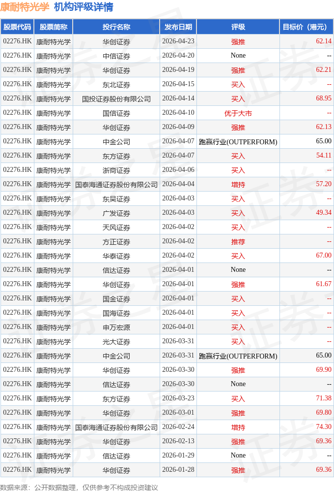 截至2026年4月27日收盘,康耐特光学(02276.HK)报收于51.05港元,下跌0.29%,成交量210.69万股,成交额1.07亿港元。投行对该股的评级以买入为主,近90天内共有13家投行给出买入评级,近90天的目标均价为64.64港元。华创证券最新一份研报给予康耐特光学强推评级,目标价62.14港元。