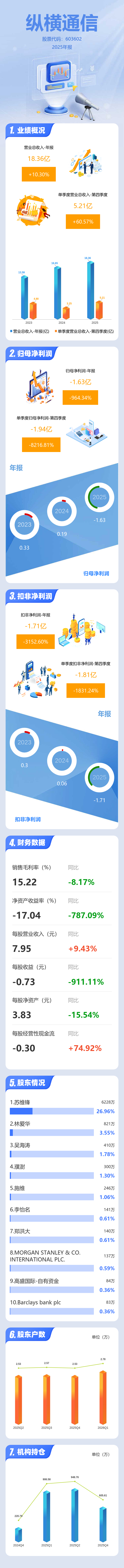 证券之星消息,纵横通信2025年年报显示,当年度公司主营收入18.36亿元,同比上升10.3%;归母净利润-1.63亿元,同比下降964.35%;扣非净利润-1.71亿元,同比下降3152.6%;其中2025年第四季度,公司单季度主营收入5.21亿元,同比上升60.57%;单季度归母净利润-1.94亿元,同比下降8216.81%;单季度扣非净利润-1.81亿元,同比下降1831.24%;负债率62.8%,投资收益-687.87万元,财务费用2972.54万元,毛利率15.22%。