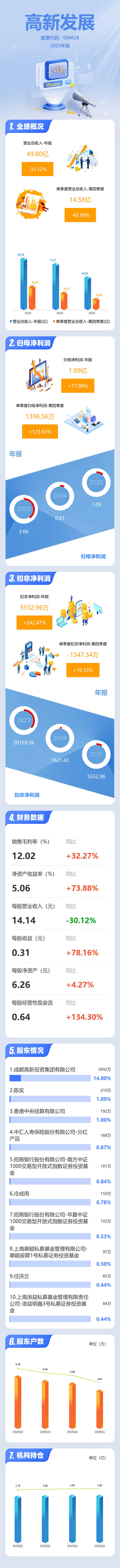 证券之星消息,高新发展2025年年报显示,当年度公司主营收入49.8亿元,同比下降30.12%;归母净利润1.09亿元,同比上升78.0%;扣非净利润5552.96万元,同比上升242.48%;其中2025年第四季度,公司单季度主营收入14.58亿元,同比下降40.99%;单季度归母净利润1396.56万元,同比上升123.64%;单季度扣非净利润-1547.54万元,同比上升76.33%;负债率82.41%,投资收益2985.24万元,财务费用6122.56万元,毛利率12.02%。