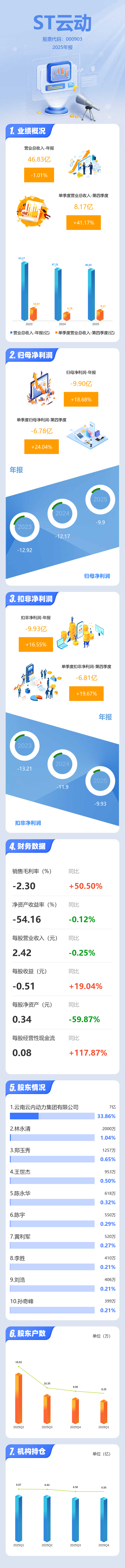证券之星消息,ST云动2025年年报显示,当年度公司主营收入46.83亿元,同比下降1.01%;归母净利润-9.9亿元,同比上升18.69%;扣非净利润-9.93亿元,同比上升16.56%;其中2025年第四季度,公司单季度主营收入8.17亿元,同比上升41.18%;单季度归母净利润-6.78亿元,同比上升24.05%;单季度扣非净利润-6.81亿元,同比上升19.67%;负债率93.16%,投资收益-22.43万元,财务费用1.63亿元,毛利率-2.3%。