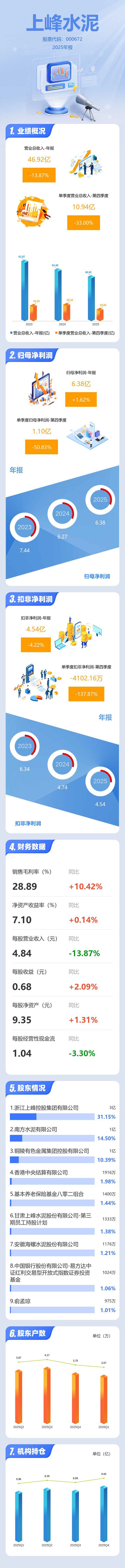 证券之星消息,上峰水泥2025年年报显示,当年度公司主营收入46.92亿元,同比下降13.87%;归母净利润6.38亿元,同比上升1.62%;扣非净利润4.54亿元,同比下降4.23%;其中2025年第四季度,公司单季度主营收入10.94亿元,同比下降33.0%;单季度归母净利润1.1亿元,同比下降50.83%;单季度扣非净利润-4102.16万元,同比下降137.87%;负债率41.26%,投资收益-4140.12万元,财务费用7537.64万元,毛利率28.89%。