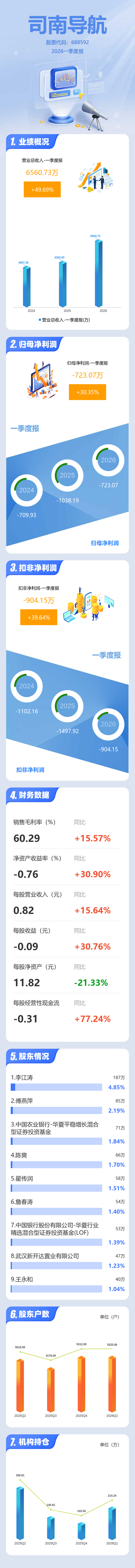 证券之星消息,司南导航2026年一季报显示,一季度公司主营收入6560.73万元,同比上升49.7%;归母净利润-723.07万元,同比上升30.35%;扣非净利润-904.15万元,同比上升39.64%;负债率24.3%,投资收益78.73万元,财务费用194.93万元,毛利率60.29%。