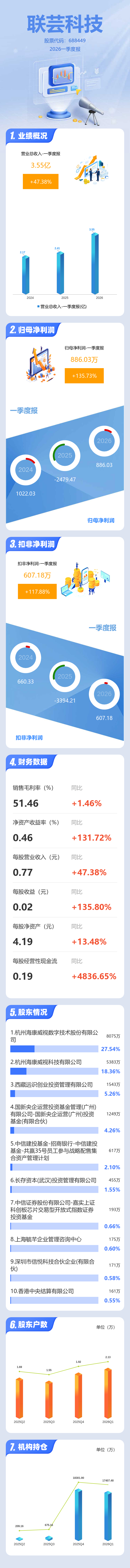 证券之星消息,联芸科技2026年一季报显示,一季度公司主营收入3.55亿元,同比上升47.38%;归母净利润886.03万元,同比上升135.73%;扣非净利润607.18万元,同比上升117.89%;负债率21.32%,投资收益55.49万元,财务费用571.22万元,毛利率51.46%。