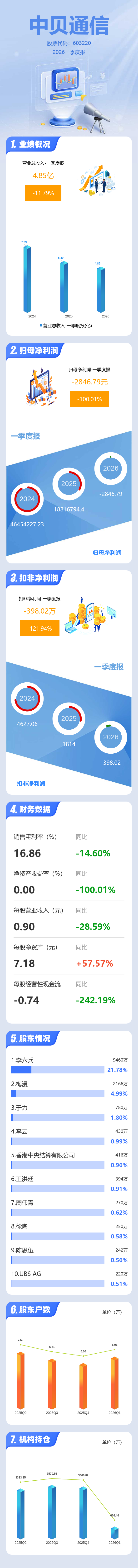 证券之星消息,中贝通信2026年一季报显示,一季度公司主营收入4.85亿元,同比下降11.8%;归母净利润-0.28万元,同比下降100.02%;扣非净利润-398.02万元,同比下降121.94%;负债率59.29%,投资收益26.12万元,财务费用4042.77万元,毛利率16.86%。
