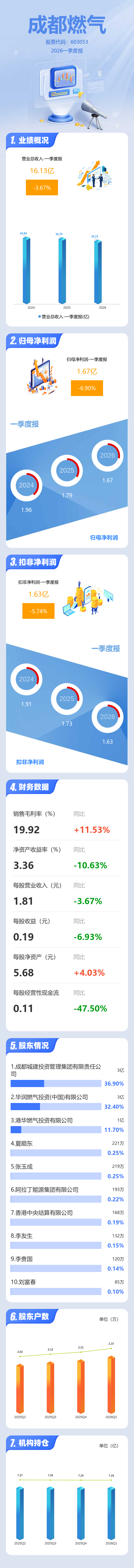 证券之星消息,成都燃气2026年一季报显示,一季度公司主营收入16.13亿元,同比下降3.68%;归母净利润1.67亿元,同比下降6.9%;扣非净利润1.63亿元,同比下降5.75%;负债率35.77%,投资收益795.68万元,财务费用-1741.68万元,毛利率19.92%。