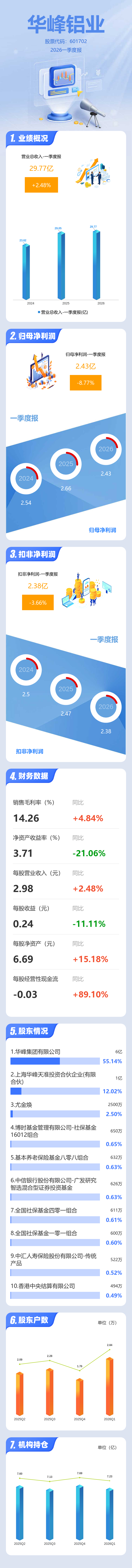 证券之星消息,华峰铝业2026年一季报显示,一季度公司主营收入29.77亿元,同比上升2.49%;归母净利润2.43亿元,同比下降8.78%;扣非净利润2.38亿元,同比下降3.66%;负债率34.29%,投资收益-71.11万元,财务费用1920.28万元,毛利率14.26%。