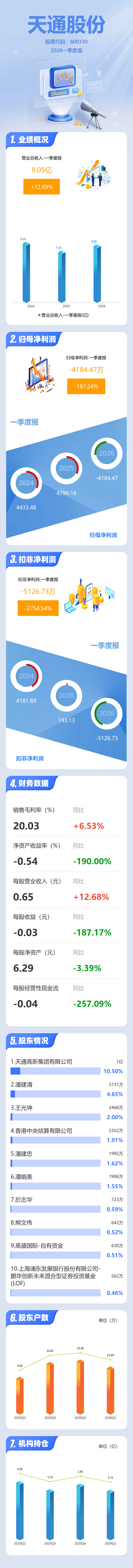 证券之星消息,天通股份2026年一季报显示,一季度公司主营收入8.05亿元,同比上升12.7%;归母净利润-4184.47万元,同比下降187.25%;扣非净利润-5126.73万元,同比下降2754.55%;负债率31.21%,投资收益-17.48万元,财务费用625.89万元,毛利率20.03%。