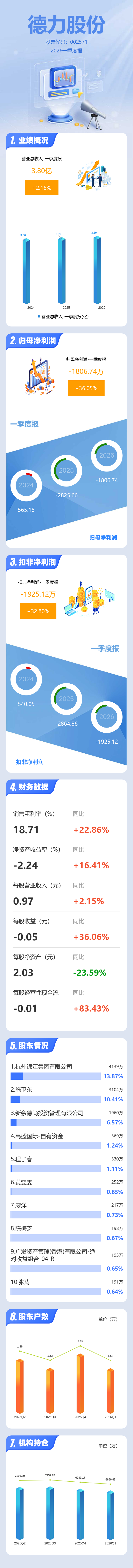 证券之星消息,德力股份2026年一季报显示,一季度公司主营收入3.8亿元,同比上升2.16%;归母净利润-1806.74万元,同比上升36.06%;扣非净利润-1925.12万元,同比上升32.8%;负债率71.61%,投资收益5.99万元,财务费用1215.81万元,毛利率18.71%。