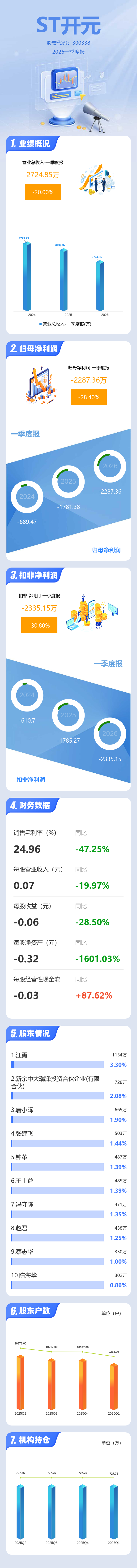 证券之星消息,ST开元2026年一季报显示,一季度公司主营收入2724.85万元,同比下降20.0%;归母净利润-2287.36万元,同比下降28.4%;扣非净利润-2335.15万元,同比下降30.8%;负债率133.86%,财务费用288.55万元,毛利率24.96%。