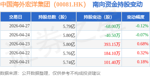 证券之星消息,4月27日南向资金减持68.0万股中国海外宏洋集团(00081.HK)。近5个交易日中,获南向资金增持的有3天,累计净增持570.15万股。近20个交易日中,获南向资金增持的有16天,累计净增持2476.25万股。截至目前,南向资金持有中国海外宏洋集团(00081.HK)5.79亿股,占公司已发行普通股的16.26%。